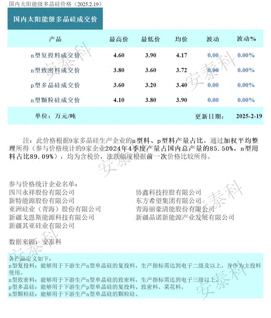 智通财经APP获悉,2月19日,硅业分会发文称,本周多晶硅价格持稳,n型复投料成交价格区间为3.90-4.60万元/吨,成交均价为4.17万元/吨,n型颗粒硅成交价格区间为3.80-4.10万元/吨,成交均价为3.90万元/吨,p型多晶硅成交价区间为3.20-3.60万元/吨,成交均价为3.40万元/吨。